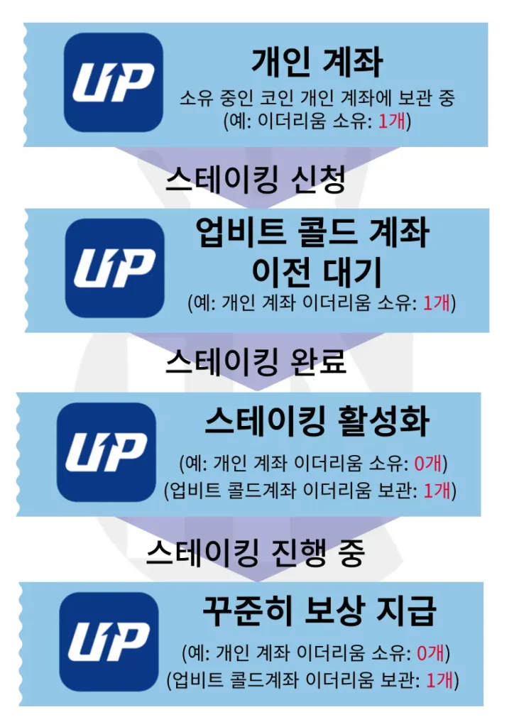 업비트 개인 계좌에 보유 중인 코인을 스테이킹 신청합니다. 이렇게 신청된 코인은 업비트로 이전 대기 상태가 되며 일정 시간 소요 후 스테이킹 활성화가 됩니다. 스테이킹 활성화가 되면 개인 계좌에 보유 중인 코인은 업비트 콜드 월렛으로 이전됩니다. 스테이킹 코인 종류에 따라 보상률과 기준이 다릅니다.